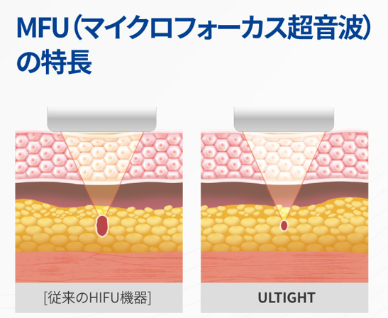 また、ULTIGHT(ウルタイト)はMFU(マイクロフォーカス超音波)を採用しており、超音波の集束点である熱凝固点のサイズが一般的なHIFU機器と比較し、非常に小さく、その凝固点サイズによって痛みを感じる程度が大幅に軽減されています。